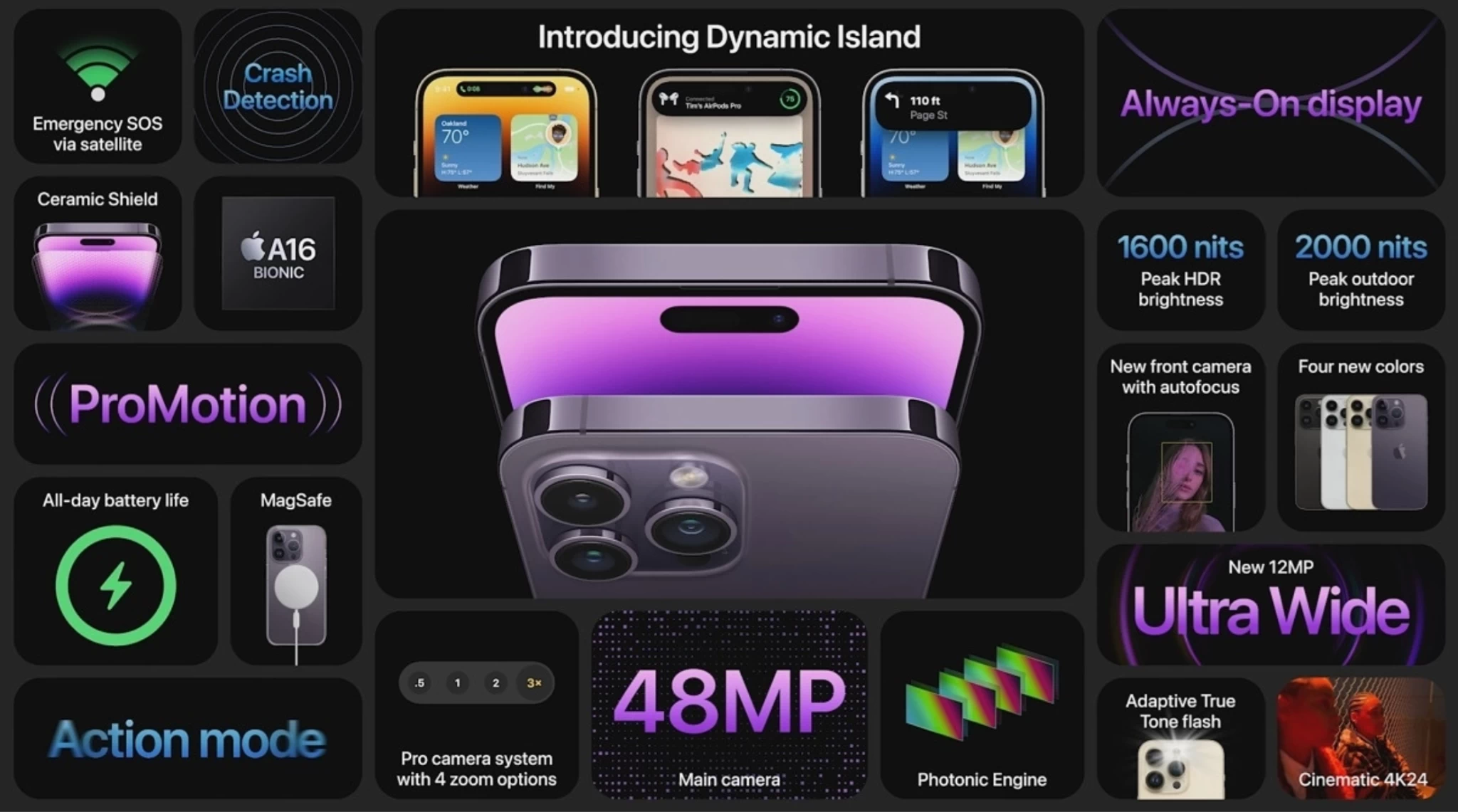 Bên cạnh đó, Apple vẫn đầu tư rất nhiều cho màn hình của các mẫu iPhone 14 Series. Đối với phiên bản iPhone 14 Pro chính hãng VN/A, màn hình có kích thước 6.1 inch với độ phân giải 2556 x 1179 pixels, được tích hợp công nghệ làm mới màn hình 120Hz cực mượt. Một số tính năng khác được tích hợp trên màn hình bao gồm HDR, Dolby Vision, True-Tone, hay thậm chí là Always-On mang đến trải nghiệm mãn nhãn cho người dùng với chất lượng hiển thị hình ảnh chi tiết, sắc nét, rực rỡ và vô cùng sống động.