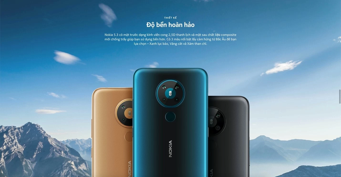 Nokia 5.3 sở hữu bộ khung nguyên khối, mặt kính trước được vát cong 2.5D sang trọng và mặt sau hoàn thiện từ composite cho khả năng chống trầy xước và độ bền dài lâu. Máy sẵn sàng với ba màu sắc chủ đạo lấy cảm hứng từ Bắc Âu là Vàng Cát, Xám than chì và Xanh lục bảo.
