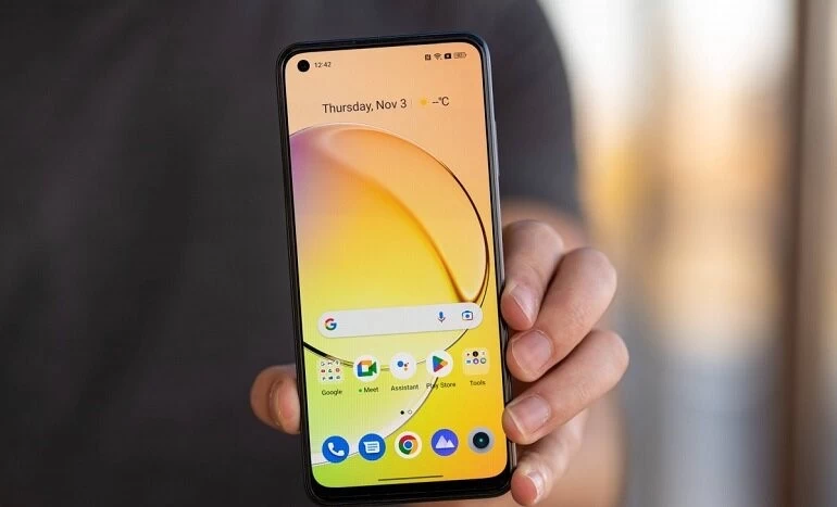Mặt trước của chiếc Realme 10 4G 8GB/256GB chính hãng là màn hình với kích thước lên tới 6.4 inch. Nhà sản xuất đã trang bị cho điện thoại tấm nền Super AMOLED 2400 x 1080 pixels với độ sáng tối đa lên tới 1000 nits và tần số quét là 90Hz. Nhờ đó điện thoại có thể hiển thị các hình ảnh rõ ràng, sắc nét với màu sắc chân thực, tự nhiên nhất. Ngoài ra, Realme 10 có tỷ lệ màn hình với thân máy là 84.4%, cùng với thiết kế notch nằm ở góc trên bên trái nên có thể tối đa không gian hiển thị nội dung. Với màn hình này, người dùng có thể thoải mái xem phim, chơi game hoặc xử lý công việc một cách dễ dàng.