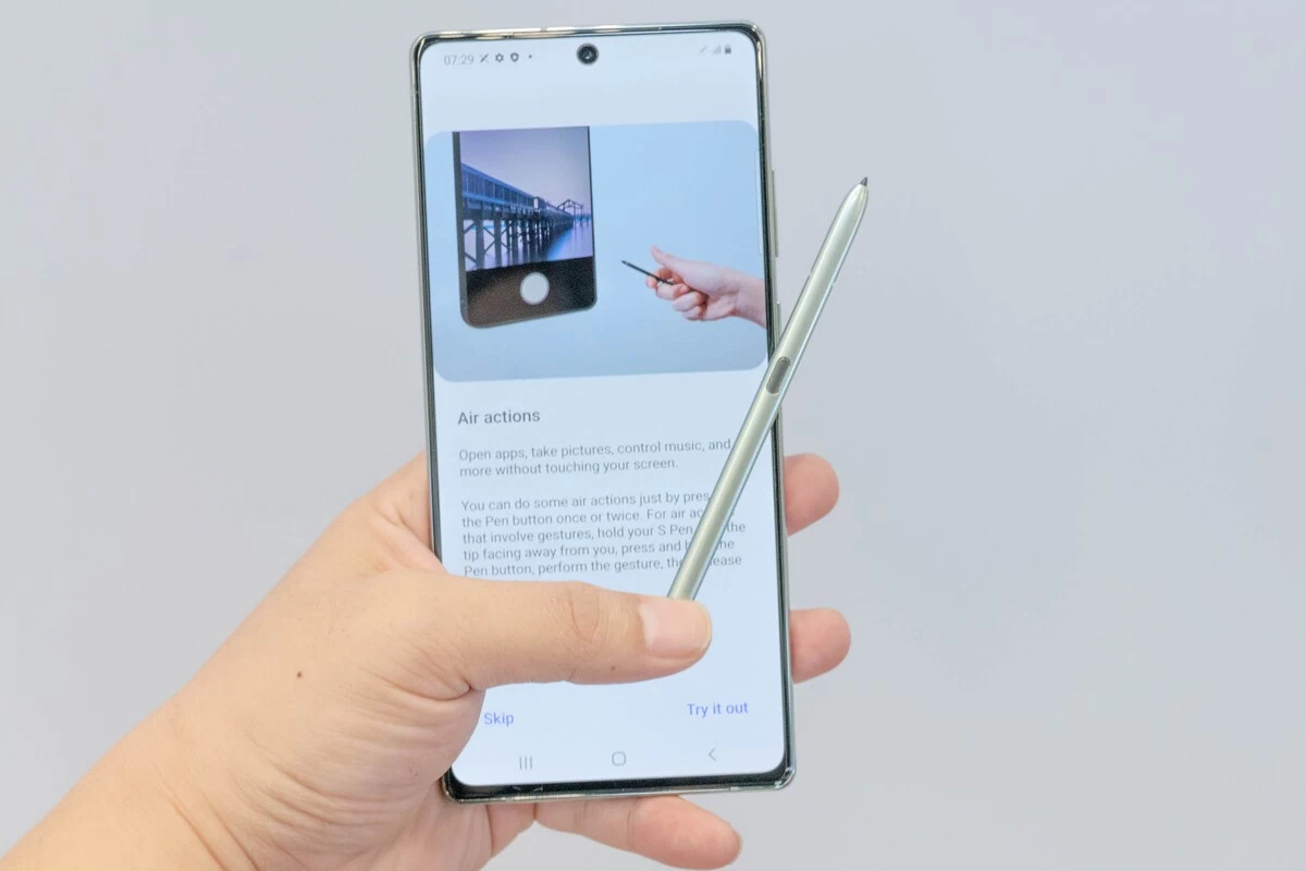 Theo công bố thì S Pen có thể dùng trong 11 giờ chỉ với 6 phút sạc. Lần này Samsung đã tích hợp thêm các cảm biến cử chỉ khi chụp ảnh như Xoay để Zoom, nâng lên - xuống để đổi camera, vuốt sang ngang để chuyển chế độ bằng cách nhấn giữ nút. Bên cạnh đó là âm thanh khi viết - vẽ trên thiết bị. Giao diện Air Command chuyển từ cong tròn sang dạng dọc.