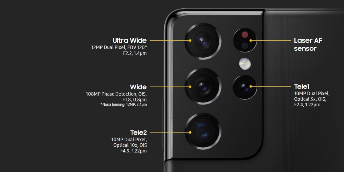 Không chỉ có thiết kế bên ngoài đẳng cấp, chiếc Galaxy S21 Ultra 5G chính hãng còn sở hữu hệ thống camera tiên tiến nhất hiện nay. Mô-đun camera hình chữ nhật chứa bốn cảm biến với một ống kính chính 108MP. Ngoài ra còn có một camera góc siêu rộng 12MP, camera tele siêu rộng 10MP và camera tele kép 10MP. Hệ thống camera này hỗ trợ chụp ảnh HDR 12 bit với màu sắc phong phú hơn 64 lần và dải động rộng hơn ba lần.