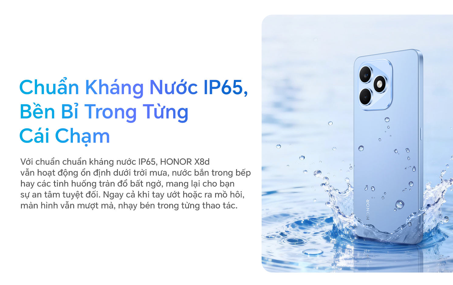 Ngoài yếu tố thiết kế, Honor X8d (8 + 128GB) còn được trang bị chuẩn kháng nước và bụi IP65, góp phần tăng độ bền và khả năng hoạt động trong những điều kiện sử dụng thường gặp như môi trường bụi nhẹ hoặc tiếp xúc nước ở mức cơ bản.