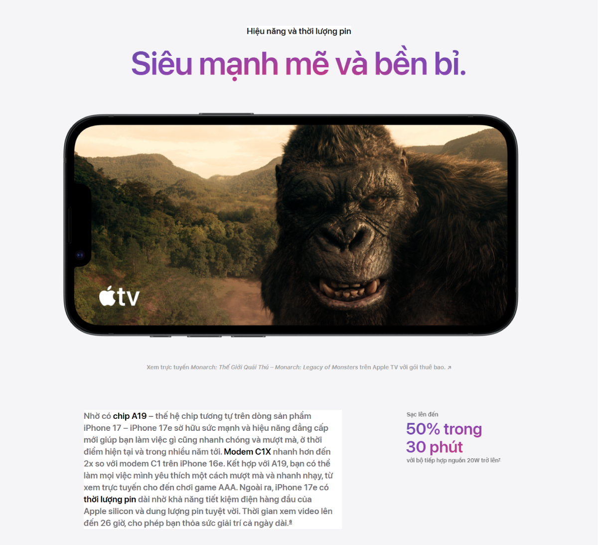 Pin iPhone 17e thực sự đủ dùng cả ngày mà không cần lo ngắt nguồn giữa chừng 26 giờ xem video và 21 giờ stream trực tuyến là con số ấn tượng với thân máy mỏng 7,80mm. Sạc nhanh 50% chỉ trong 30 phút với adapter 20W, đủ để lên đường ngay khi cần gấp. MagSafe và Qi2 hỗ trợ sạc không dây 15W, tương thích rộng rãi với hệ sinh thái phụ kiện ngày càng đa dạng.