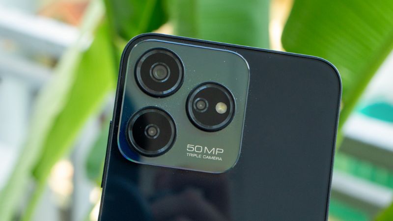 Các góc máy được bo tròn, khung máy chắc chắn nên khi cầm không bị ọp ẹp. Ngoài ra, mặt sau của điện thoại nổi bật với mô-đun camera lớn chiếm khoảng 2/3 lưng máy. Hiếm có chiếc điện thoại giá rẻ nào sở hữu cụm camera lớn như vậy.