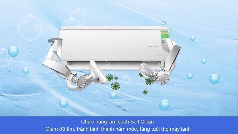 Điều hòa Midea MSAFA-13CRDN8 được trang bị công nghệ Self Cleaning có khả năng tự động làm sạch dàn lạnh. Công nghệ này hoạt động với cơ chế tự động đóng băng, sau đó làm tan băng để cuốn trôi các loại bụi bẩn, nấm mốc và dầu mỡ có thể gây mùi tích tụ lâu ngày trên bộ trao đổi nhiệt.