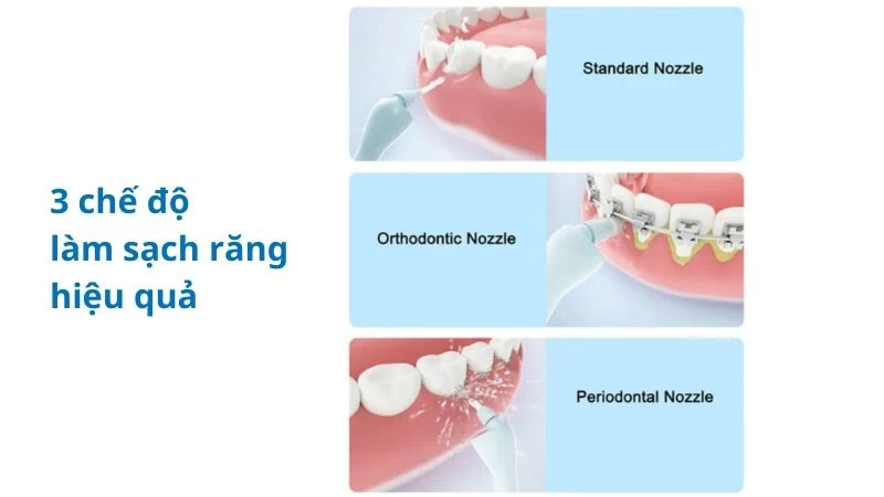 Sản phẩm này cũng rất phù hợp với những người đang niềng răng. Nó sẽ giúp loại bỏ các thức ăn bám lại trong mắc cài mà bạn khó có thể gỡ ra bằng loại tăm thông thường. Bạn có thể tuỳ chọn 3 chế độ và thay đổi dễ dàng bằng các thao tác ấn trên thân thiết bị.