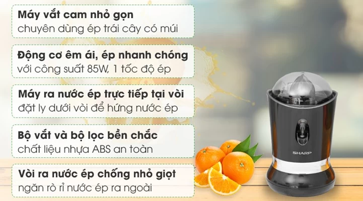 Máy vắt cam Sharp EJ-J850-BK là người bạn đồng hành không thể thiếu cho những ai yêu thích thức uống tươi ngon và lành mạnh. Với công suất 85W mạnh mẽ, máy nhanh chóng vắt kiệt nước cam, quýt, cho bạn ly nước ép thơm ngon chỉ trong nháy mắt. Lưới lọc mịn giúp loại bỏ hoàn toàn bã, mang đến ly nước ép sánh mịn, dễ uống. Thiết kế nhỏ gọn, dễ vệ sinh và đặc biệt là rất bền bỉ, máy vắt cam Sharp EJ-J850-BK chắc chắn sẽ làm hài lòng ngay cả những khách hàng khó tính nhất.