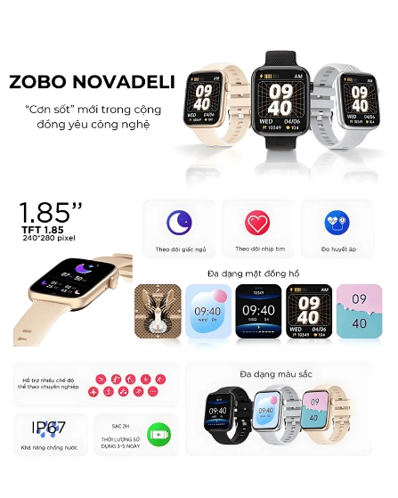 3. Tiện ích Môn thể thao: Đạp xe, Đi bộ, Yoga, Nhảy dây, Leo núi, Cầu lông, Bóng rổ, Chạy bộ, Bóng đá, ... Hỗ trợ nghe gọi: Nghe gọi ngay trên đồng hồ Tiện ích đặc biệt: Nhấc cổ tay sáng màn hình Chống nước / Kháng nước: Kháng nước IP67 (Rửa tay, đi mưa) Theo dõi sức khoẻ: Đo nồng độ oxy trong máu (SpO2), Đo huyết áp, Tính quãng đường chạy, Tính lượng calories tiêu thụ, Theo dõi giấc ngủ, Theo dõi chu kỳ kinh nguyệt, Nhắc nhở uống nước, Nhắc nhở ít vận động, Đo nhịp tim, Đếm số bước chân Tiện ích khác: Tìm đồng hồ, Trợ lý giọng nói, Không làm phiền, Chế độ tiết kiệm năng lượng, Đồng hồ đếm ngược, Đồng hồ bấm giờ, Điều khiển chụp ảnh, Điều khiển chơi nhạc, Tìm điện thoại, Dự báo thời tiết, Báo thức, Loa và mic tích hợp Hiển thị thông báo: Line, Messenger (Facebook), Viber, Zalo, Tin nhắn, Cuộc gọi