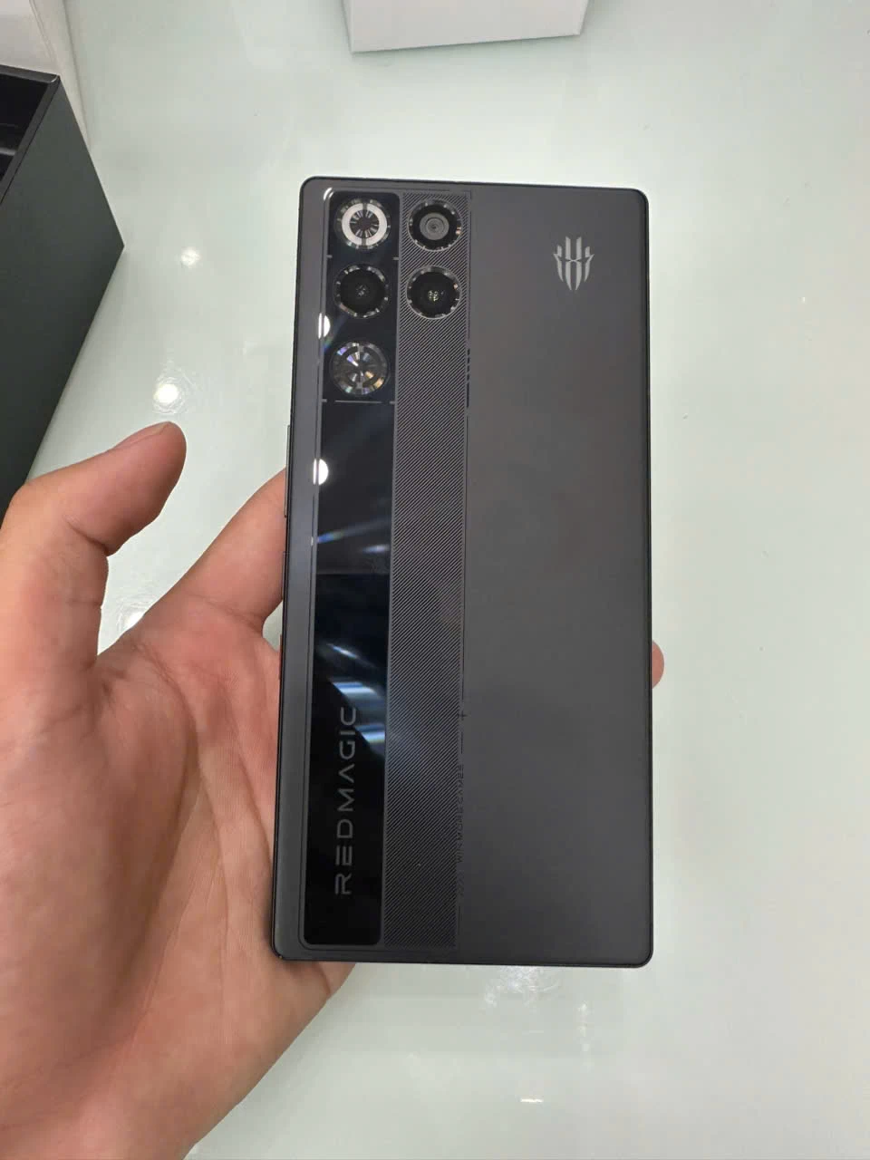 Kích thước 163.82 x 76.54 x 8.9 mm cùng trọng lượng 230g mang đến cảm giác cầm nắm chắc chắn và đậm chất thiết kế gaming đặc trưng của dòng REDMAGIC.