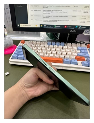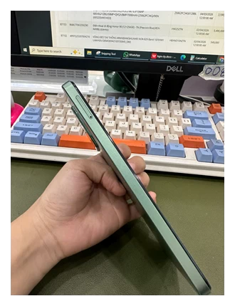 Các nút bấm vật lý được bố trí hợp lý, dễ dàng thao tác bằng một tay. Cạnh phải chứa nút nguồn tích hợp cảm biến vân tay một chạm, cho phép mở khóa nhanh chóng và tiện lợi. Cạnh trái là nơi đặt khay SIM và nút tăng giảm âm lượng. Tổng thể, thiết bị này sở hữu thiết kế đẹp mắt, phù hợp với giới trẻ năng động, yêu thích sự đơn giản nhưng vẫn toát lên vẻ hiện đại.