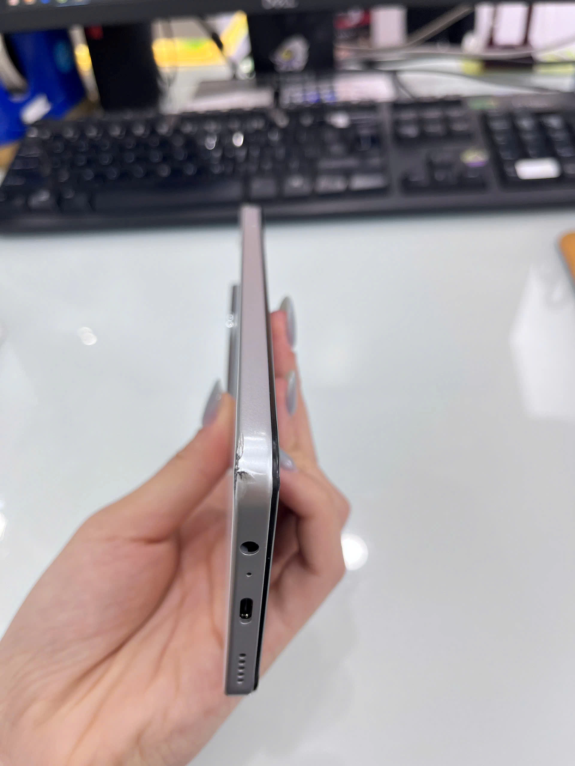 - Máy móp cạnh trên, cạnh góc dưới bên trái, cấn xước nhiều
