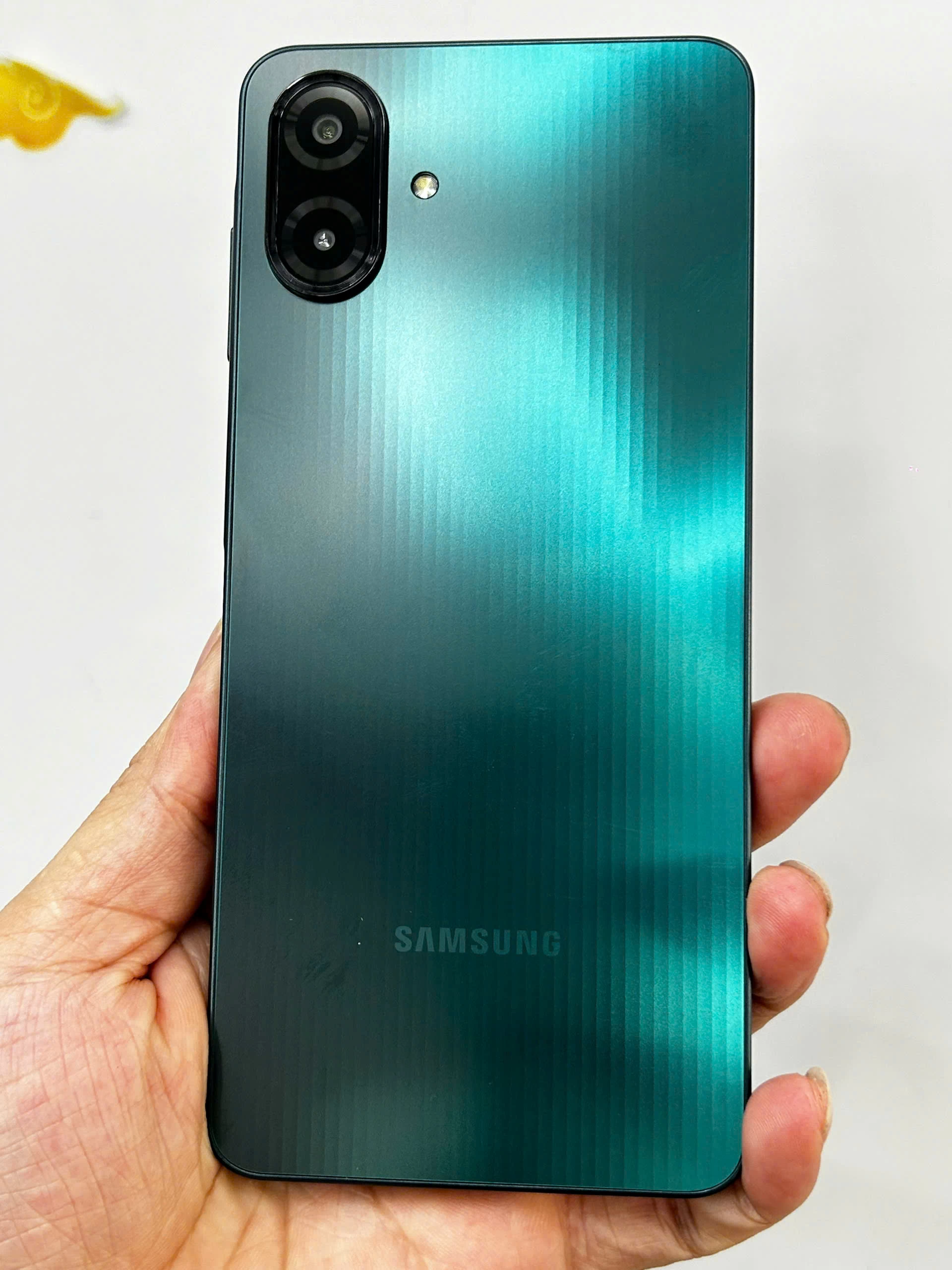 Samsung Galaxy A07 sở hữu thiết kế quen thuộc nhưng vẫn tạo được nét riêng nhờ cụm camera kép đặt dọc hình viên thuốc và logo Samsung in ở phần dưới mặt lưng. Phần vỏ được hoàn thiện từ nhựa polycarbonate với bề mặt nhám, hạn chế bám vân tay và cho cảm giác cầm nắm chắc tay. Các cạnh máy bo cong nhẹ tạo sự thoải mái khi sử dụng lâu dài.
