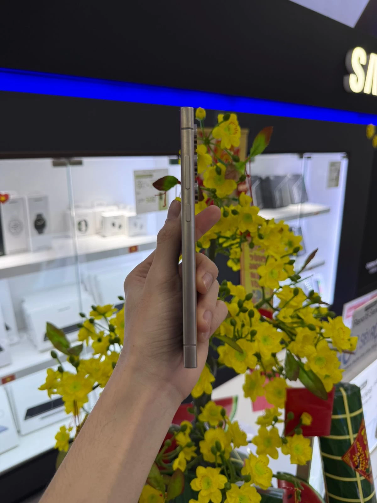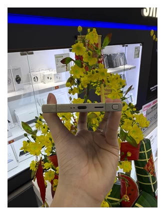 Chiếc S24 Ultra sở hữu thiết kế sang trọng và tinh tế trong từng chi tiết, đánh dấu sự đổi mới đáng kể so với các thế hệ trước. Điểm nổi bật đầu tiên là việc sử dụng khung viền được làm từ Titanium - một vật liệu nổi tiếng về độ bền và nhẹ. Nhờ đó, máy không chỉ mang lại cảm giác chắc chắn khi cầm nắm mà còn góp phần vào vẻ đẹp sang trọng của thiết bị.