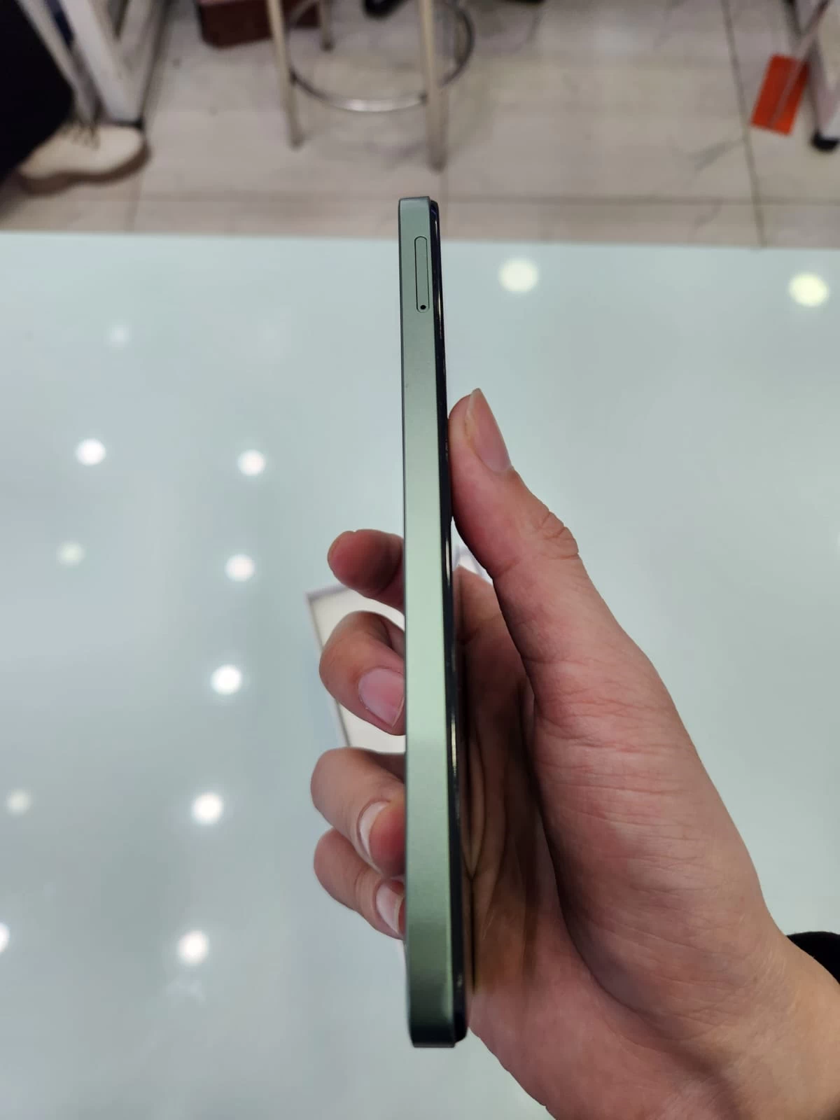 Các nút bấm vật lý được bố trí hợp lý, dễ dàng thao tác bằng một tay. Cạnh phải chứa nút nguồn tích hợp cảm biến vân tay một chạm, cho phép mở khóa nhanh chóng và tiện lợi. Cạnh trái là nơi đặt khay SIM và nút tăng giảm âm lượng. Tổng thể, thiết bị này sở hữu thiết kế đẹp mắt, phù hợp với giới trẻ năng động, yêu thích sự đơn giản nhưng vẫn toát lên vẻ hiện đại.