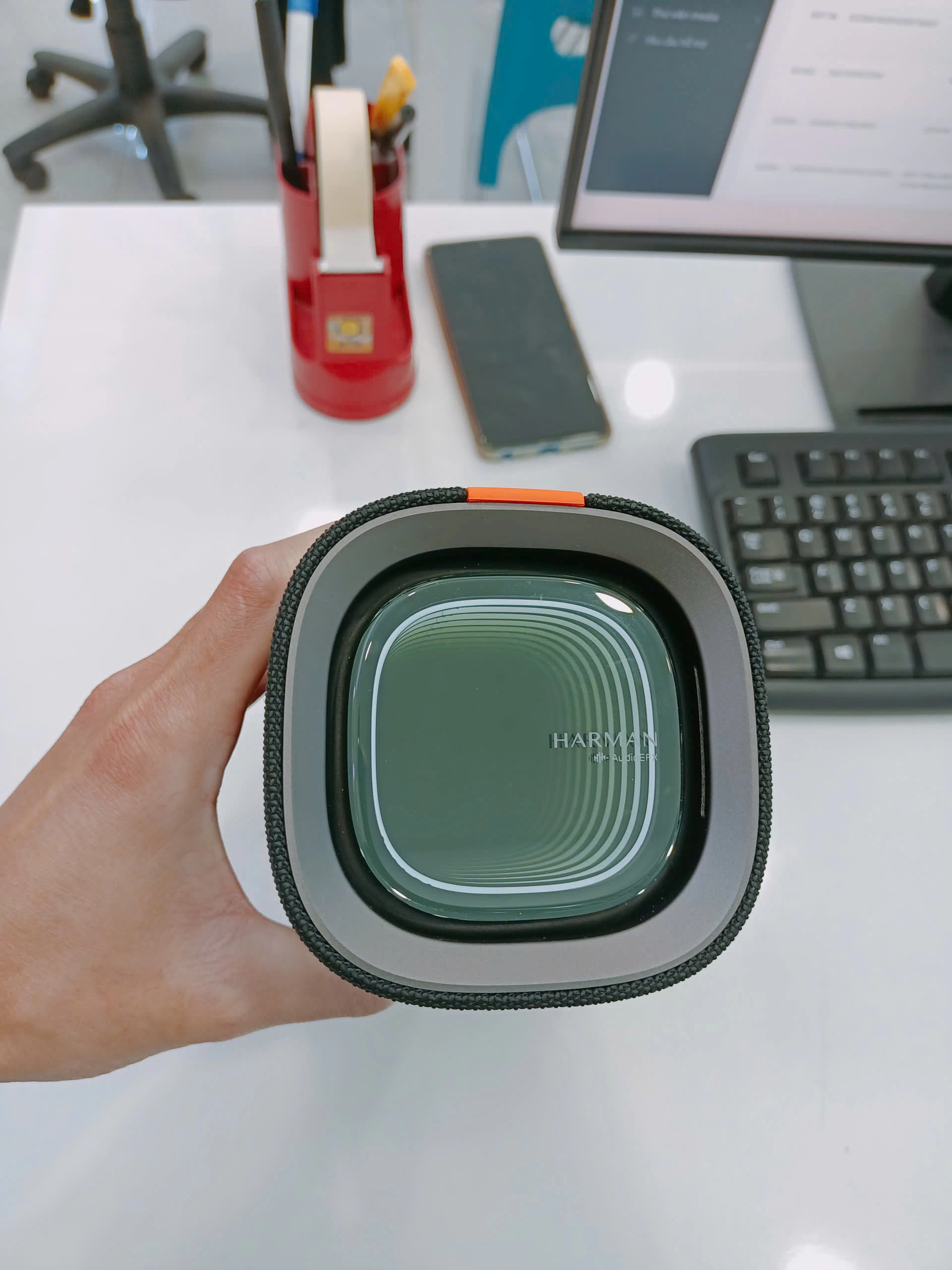 Điểm nhấn nằm ở tay xách tiện lợi ở phía trên - một chi tiết tưởng chừng nhỏ nhưng cực kỳ hữu dụng. Bạn có thể dễ dàng mang loa đi picnic, leo núi hay đặt trong xe ô tô mà không lo chiếm diện tích. Với trọng lượng chỉ 1.2kg, chiếc loa vừa đủ để dễ mang theo nhưng vẫn đảm bảo sự vững chắc cho âm thanh lớn.