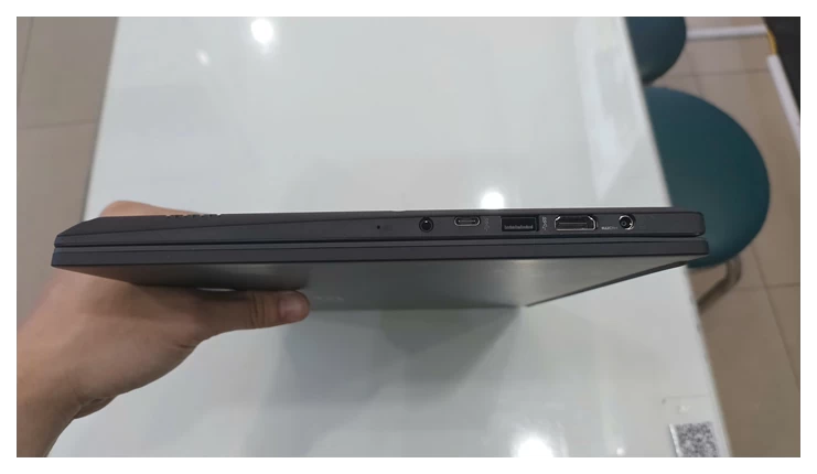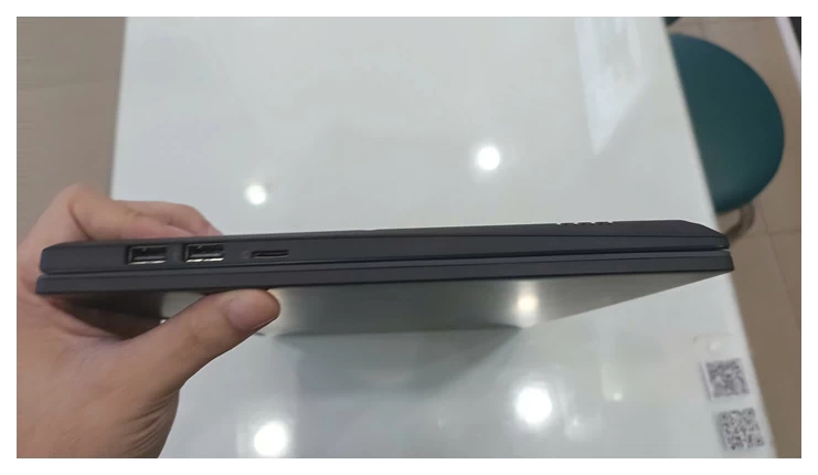 Độ mỏng của thiết bị cho phép người dùng bỏ vào túi và mang theo khi di chuyển ra bên ngoài làm việc hoặc các chuyến công tác. Các đường nét của laptop được làm vuông vắn, kiểu cổ điển và màu đen sang trọng. Bên cạnh đó, phần bản lề máy được nâng cấp để đảm bảo độ bền cho thiết bị.