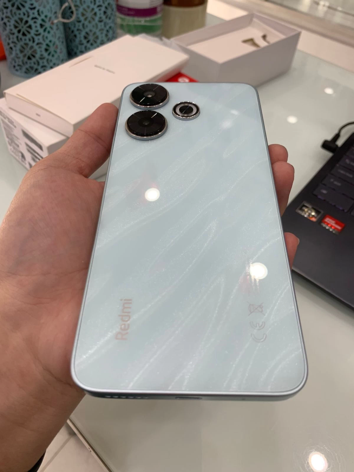 Xiaomi Redmi 13 (8GB+128GB) được hoàn thiện với mặt lưng kính nhưng được xử lý bóng mượt, tạo cảm giác như một sản phẩm cao cấp. Khi nghiêng máy dưới ánh sáng, mặt lưng phản chiếu lấp lánh trông rất bắt mắt. Thiết kế này không chỉ đẹp mà còn ít bám vân tay hơn so với các chất liệu khác.