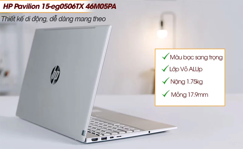 Nhìn chung, Laptop HP Pavilion 15-eg0506TX - 46M05PA được khoác lên vẻ ngoài ngôn ngữ thiết kế phổ biến từ dòng HP Pavilion. Với những đường nét nam tính, chiếc máy này vô cùng nhẹ nhàng khi trọng lượng chỉ ở mức 1.7Kg và độ dày 17.9mm. Kích thước này của máy sẽ giúp người dùng dễ dàng mang thiết bị đi làm việc ở nhiều địa điểm khác nhau như văn phòng, quán cà phê,….