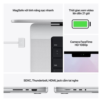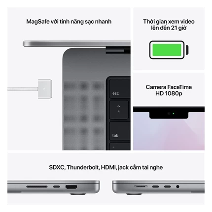 Dòng laptop này cũng được trang bị bảo mật vân tay an toàn tuyệt đối, giúp người dùng mở máy nhanh chóng, thanh toán online thuận tiện, bảo mật thông tin tốt hơn. Bên cạnh đó, máy cũng được trang bị đầy đủ các cổng kết nối như HDMI, Jack cắm tai nghe 3.5 mm, 3 cổng Thunderbolt 4 và sạc nhanh bằng cổng MagSafe 3 thuận tiện.