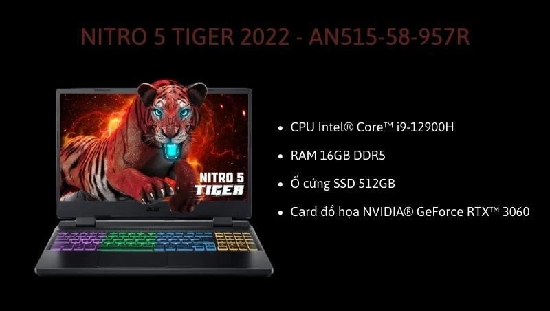 Acer Nitro 5 Tiger AN515-58-957R là một trong những sản phẩm đáng chú ý của Acer trong năm 2022, không chỉ vì tên gọi mà còn vì sự mạnh mẽ của con chip Intel thế hệ 12. Được trang bị bộ vi xử lý Intel Core i9-12900H, Nitro 5 Tiger đã được đánh giá là một trong những “mãnh hổ” về hiệu năng sử dụng.