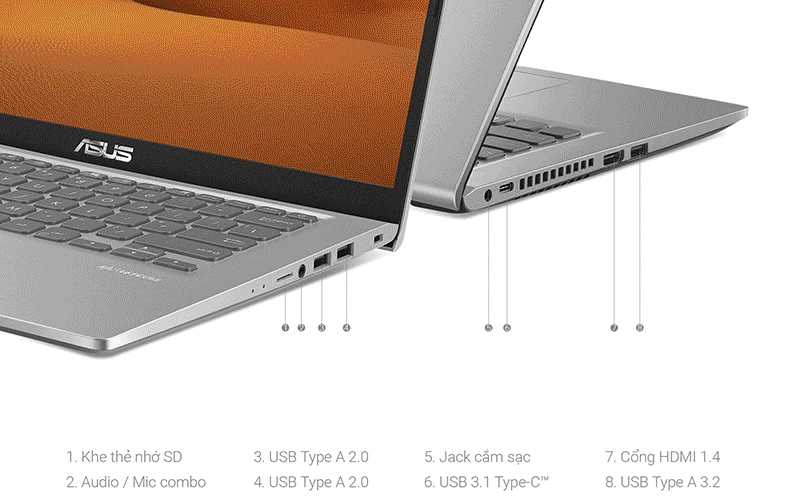 ASUS Vivobook X415EA-EB640W được trang bị gần như là đầy đủ mọi loại cổng kết nối phổ biến hiện nay bao gồm cổng USB 3.1 Type-C; cổng USB 3.2; cổng USB 2.0; cổng xuất hình ảnh HDMI, khe cắm thẻ nhớ SD cùng với cổng cắm tai nghe và mic chuẩn 3.5mm. Tất cả nhằm mang lại cho người dùng trải nghiệm thuận tiện nhất trong quá trình làm việc cũng như học tập hàng ngày.
