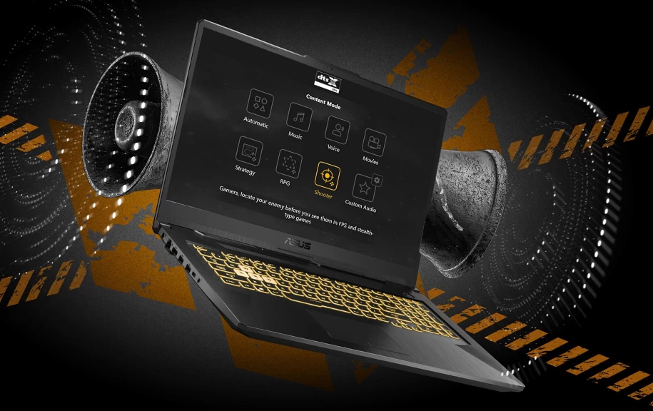 Không chỉ được đầu tư về hình ảnh, ASUS còn nâng cấp tối đa trải nghiệm âm thanh trên chiếc laptop TUF Gaming này. Công nghệ âm thanh DTS:X Ultra mang đến âm thanh trung thực, trong trẻo với âm sắc rõ ràng. Âm thanh vòm kênh 7.1 cho cảm nhận về không gian trong game tốt hơn. Thêm vào đó, 8 chế độ để nghe nhạc, xem phim và chơi game giúp tối ưu hóa trải nghiệm cá nhân theo sở thích và nhu cầu của người dùng. Tính năng chống ồn AI hai chiều tiên tiến cho phép loại bỏ tiếng ồn và tạp âm từ cả micro và âm thanh trên thiết bị, mang đến những cuộc gọi hiệu quả và giây phút chìm đắm vào âm nhạc thoải mái nhất.