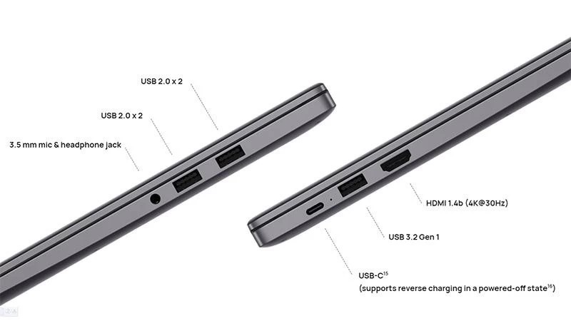 Vì là một mẫu laptop văn phòng nên Huawei Matebook D15 2022 sẽ được trang bị đầy đủ các loại cổng kết nối cần thiết bao gồm 1 cổng HDMI, 1 cổng USB-C, 2 cổng USB 2.0 Type-A, 1 cổng USB 3.2 Gen 1 Type-A và 1 cổng âm thanh 3.5mm. Các chuẩn kết nối không dây trên máy cũng đều là những chuẩn kết nối hiện đại nhất ở thời điểm hiện tại như WiFi 802.11ax (WiFi 6) cho khả năng kết nối internet không dây nhanh chóng, độ trễ thấp. Cùng với đó là Bluetooth 5.1 hỗ trợ người dùng dễ dàng hơn trong việc truyền dữ liệu và kết nối với các thiết bị không dây khác.