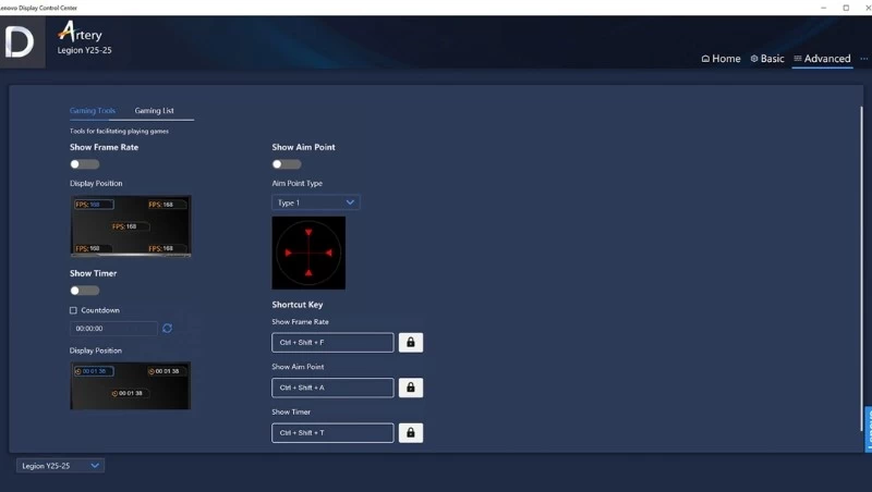 Bên cạnh những công nghệ được tích hợp, phần mềm Lenovo Artery Software sẽ đem lại trải nghiệm chơi game tốt nhất cho người dùng. Tính năng này sẽ giúp bạn dễ dàng tùy chỉnh và lưu lại phần cấu hình gồm tốc độ khung hình, hẹn giờ, hiển thị điểm mục tiêu và thiết lập các phím tắt.