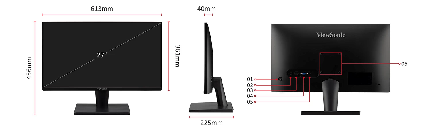 Màn hình ViewSonic VA2715-H sở hữu đa dạng các cổng kết nối như Joy Key, Power in, HDMI 1.4, VGA, 3.5mm Audio Out, VESA Compatible (Wall Mount 100 x 100mm).