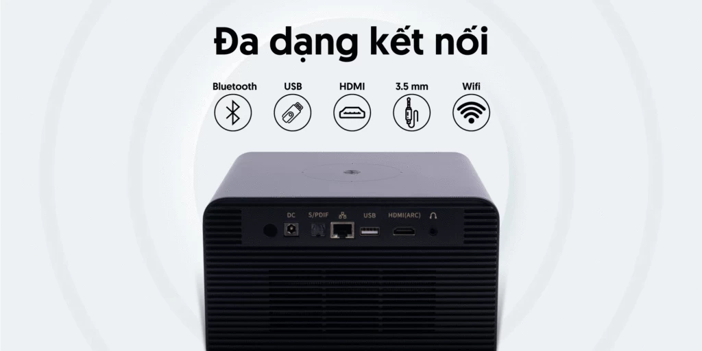 - Đa dạng cổng kết nối ngoại vi như USB, HDMI hoặc kết nối không dây Bluetooth, cùng bộ nhớ RAM 3GB, ROM 32GB, cho phép sử dụng máy chiếu ở mọi hoàn cảnh, tương thích với nhiều thiết bị ở nhiều không gian khác nhau