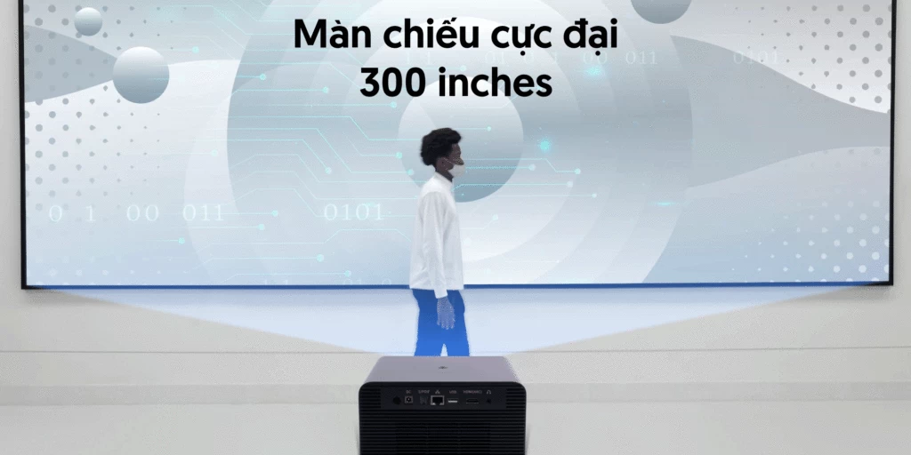 - Có thể chiếu với khung hình lên đến 300 inches full HD với khoảng cách chiếu tương đương 3,2 mét. Máy chiếu có khả năng điều chỉnh lấy nét tự động, cùng tính năng hiệu chỉnh Keystone chỉnh méo tự động, giúp người dùng không cần động tay, đặt máy chiếu ở mọi góc độ mà không lo bị lệch khung hình hay mờ 4 góc như các loại máy chiếu khác.