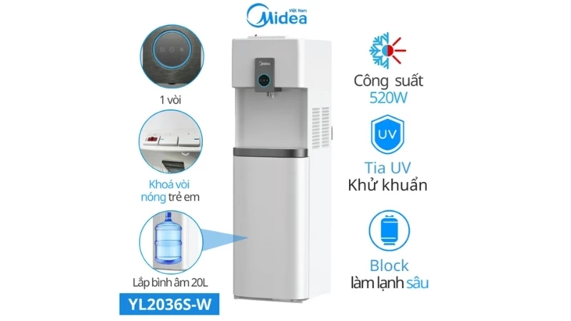 Cây nước Midea YL2036S-W được trang bị công nghệ làm lạnh Block hiện đại, cho khả năng làm lạnh nhanh và sâu đến ≤10°C, đồng thời công suất làm nóng đạt 420W, giúp nước đạt ~85°C nhanh chóng. Thiết kế bình âm tinh tế giúp tiết kiệm diện tích và dễ thay bình. Dung tích bình lạnh 3,6 lít và nóng 1,16 lít đáp ứng tốt nhu cầu sử dụng hàng ngày. Ngoài ra, máy còn tích hợp khóa an toàn trẻ em, hệ thống khử trùng bằng ozone và vật liệu kháng khuẩn, đảm bảo an toàn cho sức khỏe người dùng.