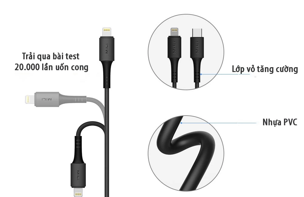 Nhiều thiết bị điện tử từ nhiều nhà sản xuất công nghệ có những dấu hiệu như dễ đứt ngầm, gãy hoặc bị bong tróc lớp bảo vệ sau một thời gian sử dụng. Nhưng với MiLi bạn hoàn toàn có thể yên tâm về vấn đề này, cáp C to Lightning - HI-L70 được làm từ nhựa PVC cao cấp, bền chắc, chịu lực tốt và chống gãy nứt trong thời gian sử dụng. Cáp đã trải qua bài test 20.000 lần gấp và uốn cong nhưng vẫn nguyên vẹn.