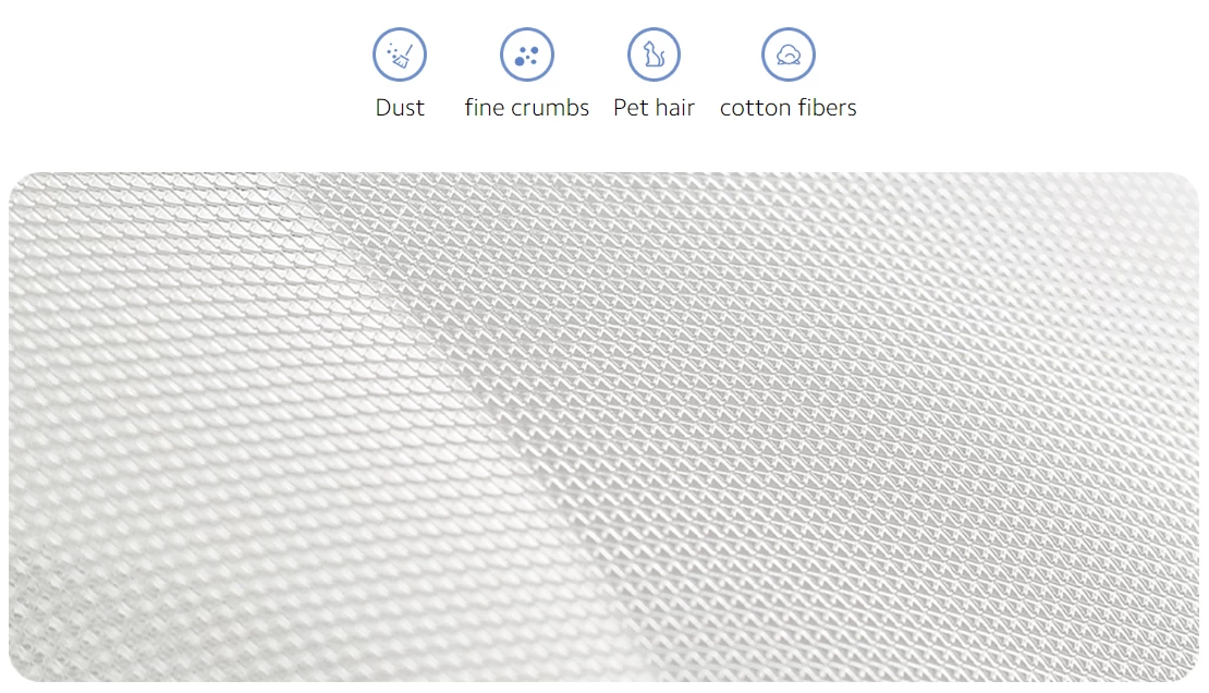 Lớp lọc đầu tiên lọc các hạt lớn cũng như bụi và lông động vật với màn quây 360 °. Bộ lọc chính cung cấp khả năng lọc ban đầu bằng cách lọc bụi, tóc, mảnh vụn mịn trong số các hạt lớn khác và có khả năng chống nhăn, chống các dung dịch dầu, axit, kiềm giúp đảm bảo tuổi thọ lâu dài cho bộ lọc trung tâm.