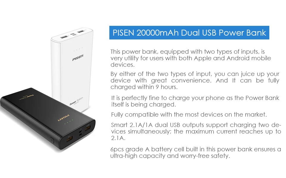 Hiện tại, Pisen cho ra dòng sản phẩm sạc dự phòng Power Station 20000mah với công nghệ mới. Tiếp cận tới người tiêu dùng nhiều hơn với dung lượng pin khá cao để đáp ứng cho các bạn có thể sạc thiết bị nhiều lần liên tục. Hỗ trợ 2 cổng USB cho bạn có thể sạc cùng lúc 2 thiết bị một cách tiện lợi.