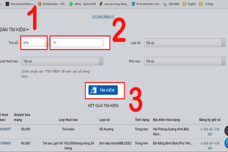 Bước 2: Chọn số điện thoại mong muốn trong danh sách các số có đầu số 0799. Bạn có thể lọc theo giá tiền, đuôi số hoặc tìm kiếm theo số yêu thích.