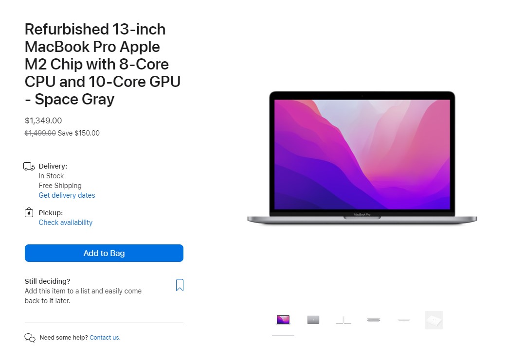 Theo đó tại Mỹ, MacBook Pro 13 inch được tân trang lại với chip M2 sẽ bán ra với giá 1.169 USD (~ 27.7 triệu đồng) cho phiên bản bộ nhớ 256GB và 1.349 USD (~ 32 triệu đồng) cho phiên bản 512GB.