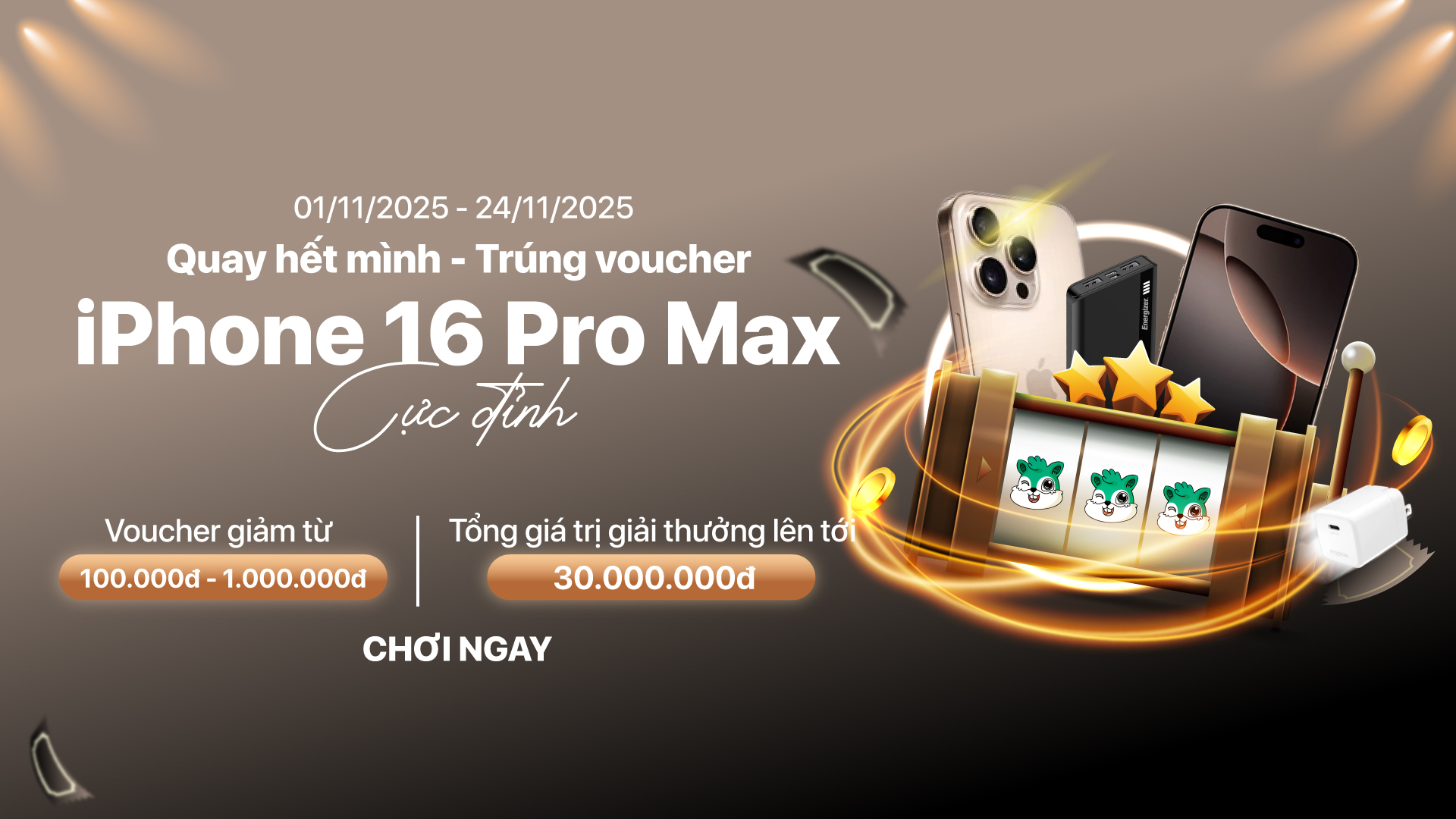 Trong tháng 11, khách hàng mua iPhone 16 Pro Max sẽ có cơ hội quay thưởng nhận voucher ưu đãi ...