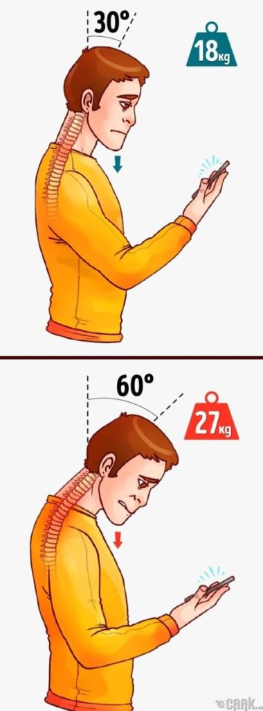 Bạn vẫn đang đọc bài viết này chứ? Và nếu đang đọc bằng điện thoại, cổ của bạn đang phải cúi xuống nhìn vào màn hình. Nếu cứ giữ tư thế này trong một khoảng thời gian dài, chắc chắn chứng đau gáy sẽ xuất hiện, bởi khi đầu bạn nghiêng một góc 45 độ, phần cổ của bạn sẽ phải chịu sức nặng tương đương 22 kg, còn nếu nghiêng 60 độ thì sức nặng sẽ tương đương 27 kg.