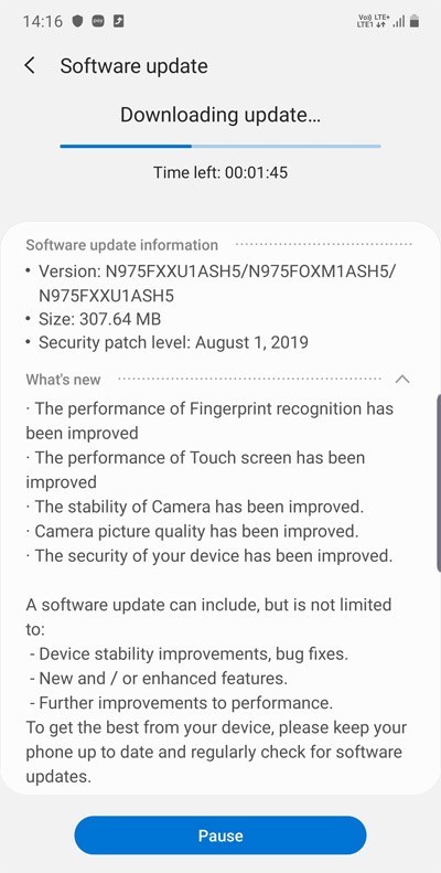 Bản cập nhật vá bảo mật trên Galaxy Note 10+ trong tháng 9 có kích thước gần 157 MB và bản dựng mang tên N975FXXU1ASHE đang được phát hành tại Ấn Độ. Nó sẽ được phát hành tại các thị trường khác trong khoảng 1 hoặc 2 tuần tới. Nếu như bạn muốn kiểm tra thông tin của bản vá bảo mật này, bạn có thể thao tác thủ công bằng cách chọn Cài Đặt điện thoại > Menu cập nhật phần mềm.
