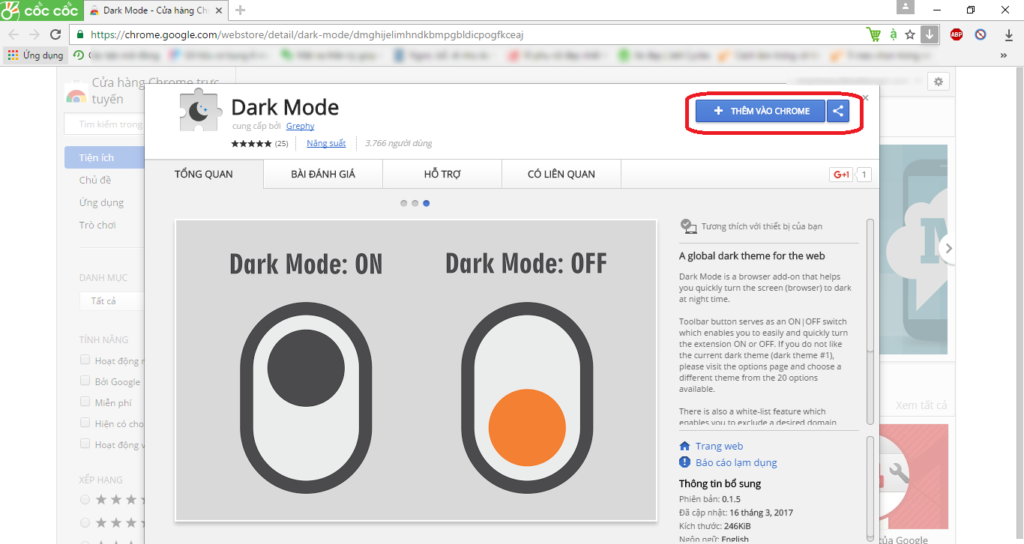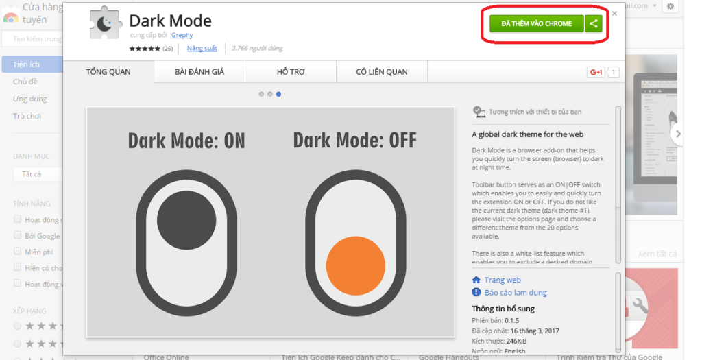 Đầu tiên, hãy tải tiện ích mở rộng Dark mode từ cửa hàng Chrome tại đây. Sau khi mở giao diện cửa hàng Chrome trực tuyến, bạn chọn vào mục “Thêm vào Chrome” để tiến hành cài đặt vào giao diện trình duyệt Web.