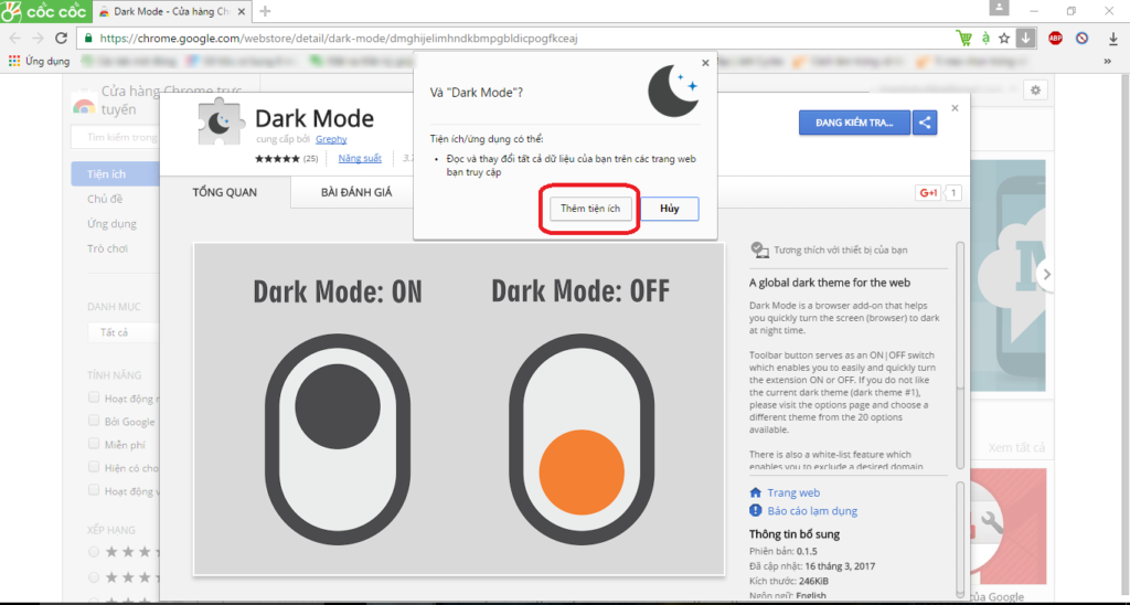Một bảng hỏi sẽ hiện lên nhằm xác nhận lại yêu cầu của bạn một lần nữa. Bạn hãy chọn “Thêm tiện ích” để bắt đầu bật Dark mode trên trình duyệt Web.
