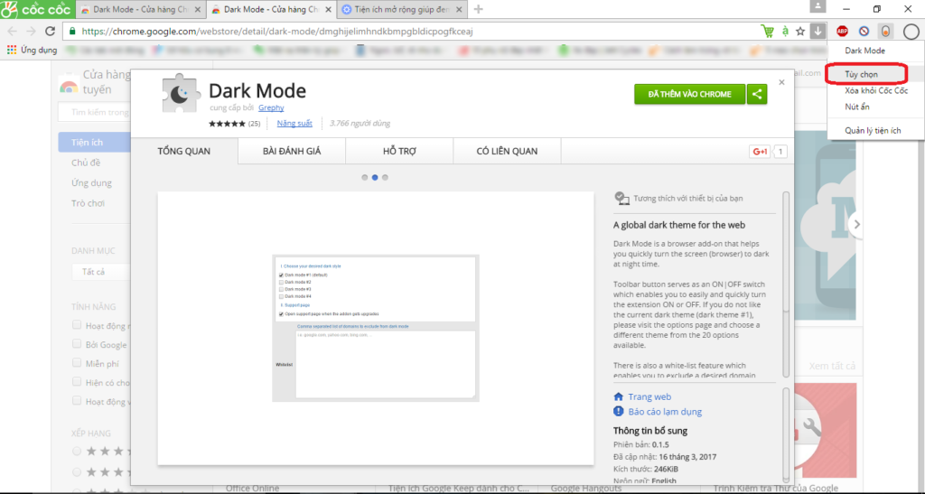 Ngoài ra, bạn còn có thể thêm sự lựa chọn bằng việc tùy chỉnh màu sắc bằng cách nhấp chuột phải vào biểu tượng chế độ Dark mode ở góc phải giao diện trình duyệt Web, sau đó bạn chọn mục “Tùy chọn”.