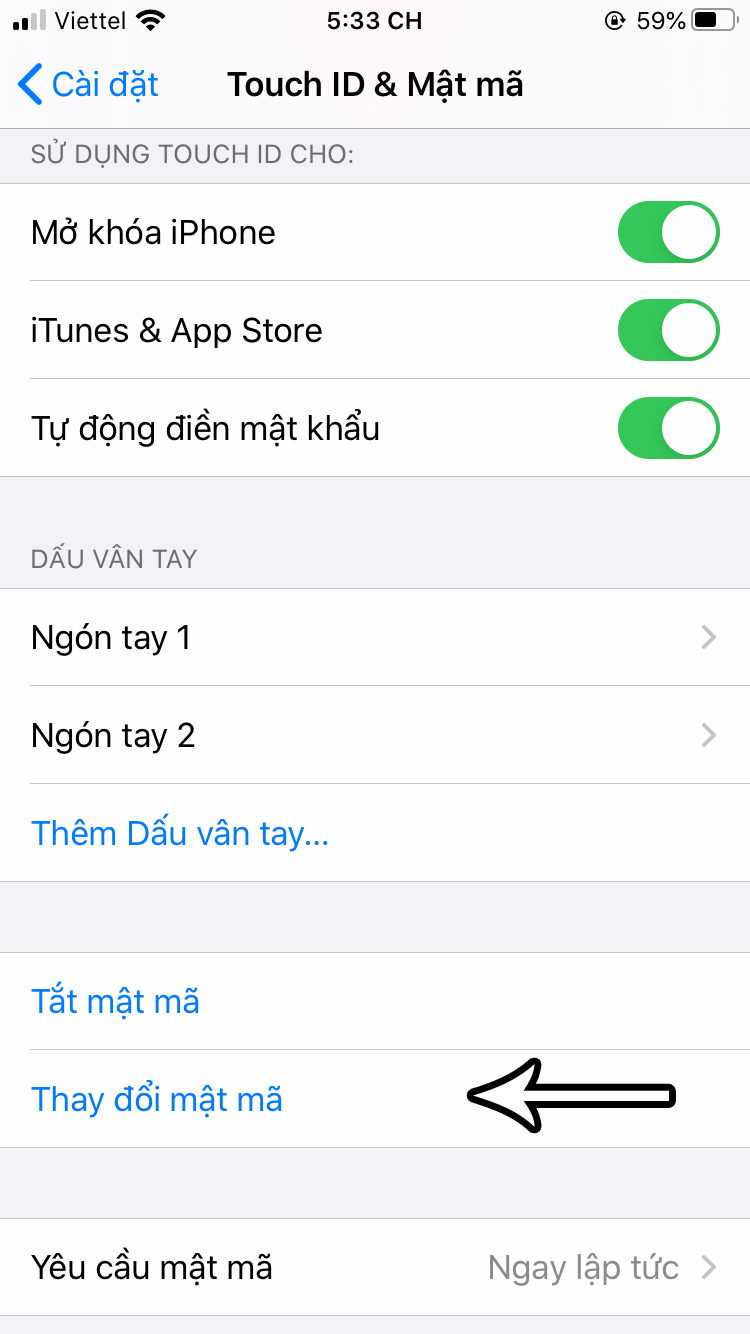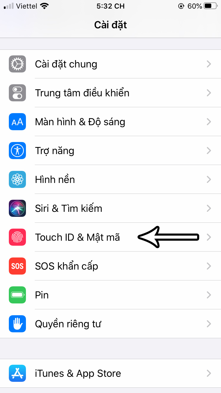 - Kéo xuống và chọn vào Touch ID & Mật mã
