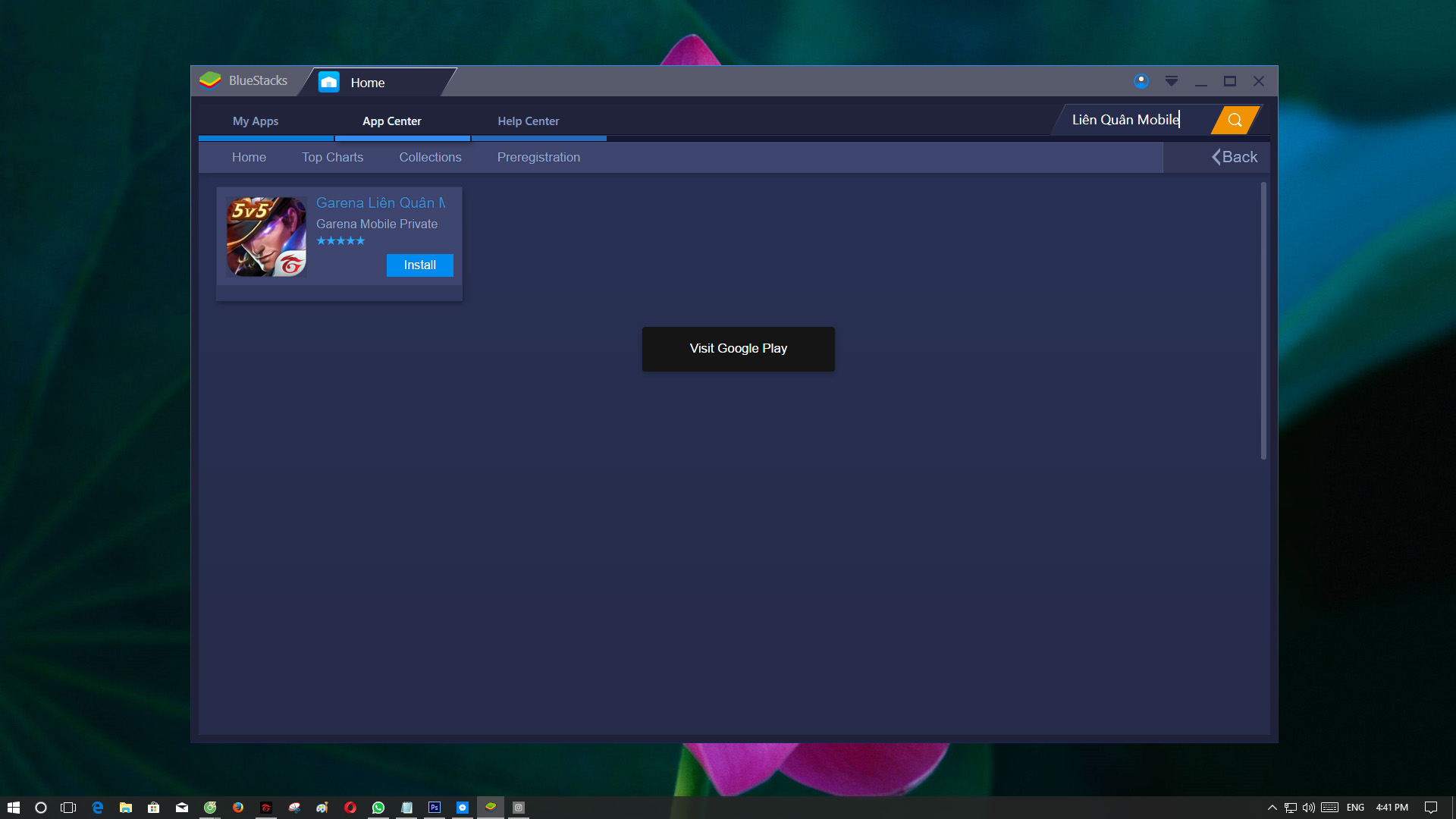 - Chọn vào ô tìm kiếm phía bên trên tay phải và nhập vào “Liên Quân Mobile”; game hiện ra bạn ấn vào Install sau đó ấn tải về.