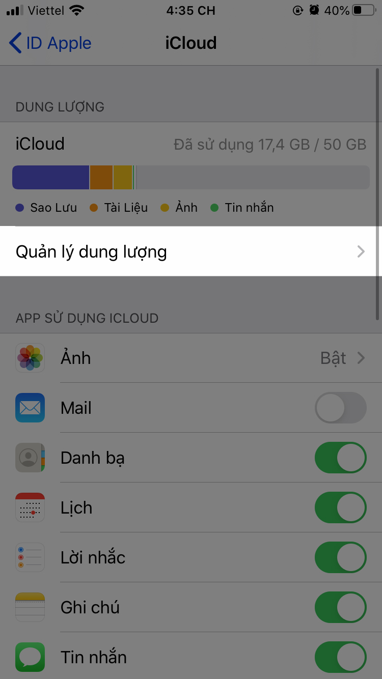 - Nhấn vào Quản lý dung lượng.