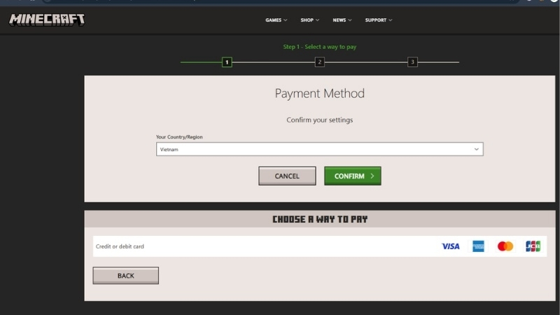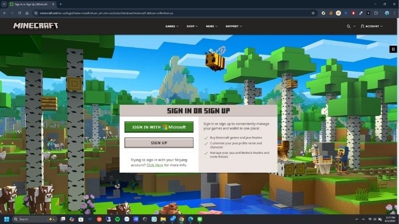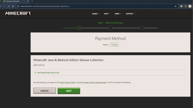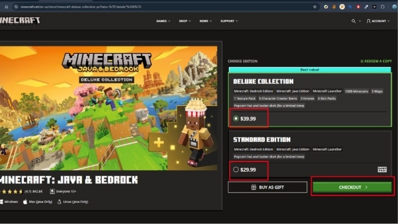 - Chọn gói “Minecraft: Java & Bedrock Edition for PC” và tiến hành thanh toán (khoảng 30–40 USD).