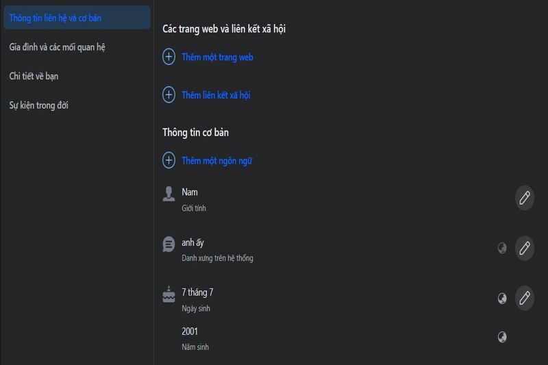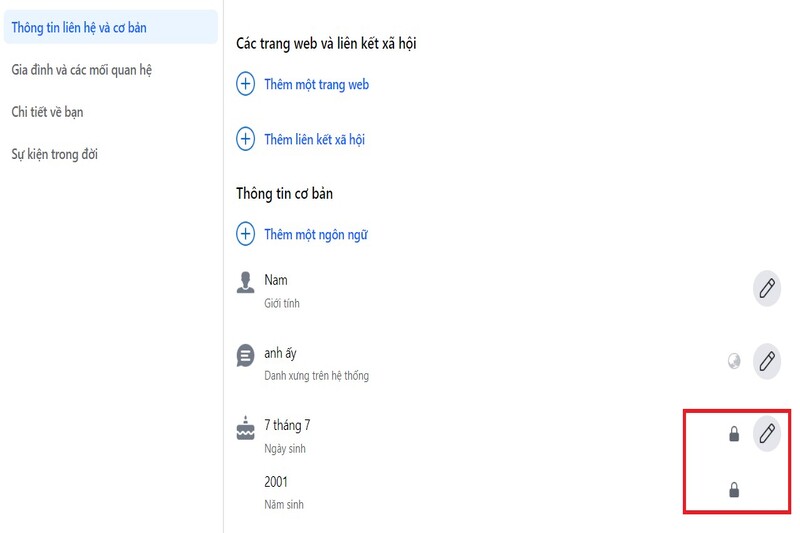 Bước 2: Đến phần Thông tin liên hệ và cơ bản trên giao diện. Sau đó chọn vào mục tùy chỉnh nằm ở phía bên phải đề mục ngày tháng năm sinh.