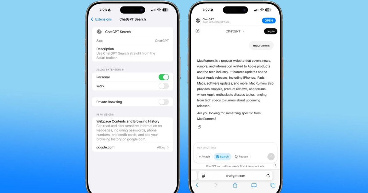 Tiện ích mở rộng này cần có quyền truy cập Google.com hoặc trang web dành cho công cụ tìm kiếm mặc định của bạn. Nhưng khi được cấp quyền, mọi tìm kiếm bạn nhập sẽ được chuyển hướng đến tính năng tìm kiếm của ChatGPT thay vì thực hiện theo mặc định trong cài đặt Safari trên các thiết bị như iPhone, iPad hay MacBook.