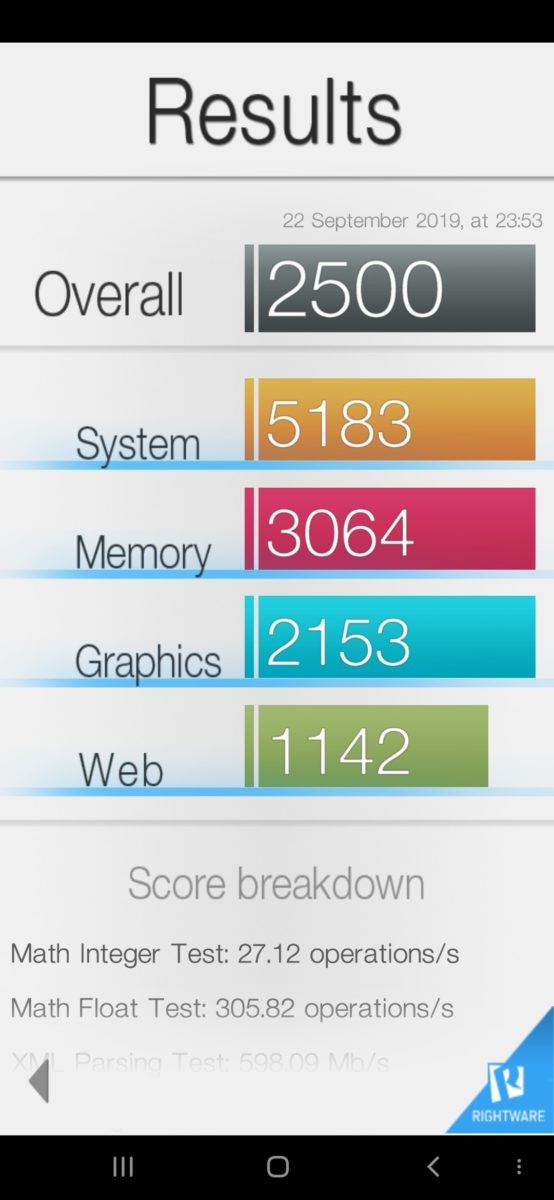 Ở AnTuTu, máy đạt 152.428 điểm. Trong khi đó, điểm số Geekbench đơn lõi là 1.674 và đa lõi là 5.329. Đây là khoảng cách nhỏ của 1.636 và 5.421 điểm trên Redmi Note 7 với Snapdragon 660.